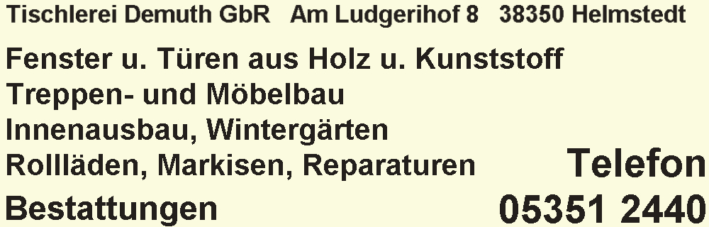rufen Sie uns unter Tel. 05351 / 2440 an oder schreiben Sie uns eine E-Mail mit Ihren Fragen an: tischlerei.demuth@t-online.de zurück zur Startseite |